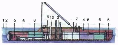 На схеме цифрами обозначены: 1 — ватерлиния судна в погруженном состоянии; 2 — ватерлиния загруженного судна в надводном положении; 3 — поплавок; 4 — водонепроницаемая надстройка; 5 и 6 — дифферентные и балластные цистерны; 7 — центральный пост; 8 — грузовые трюмы; 9 — машинное отделение; 10 — котельное отделение.