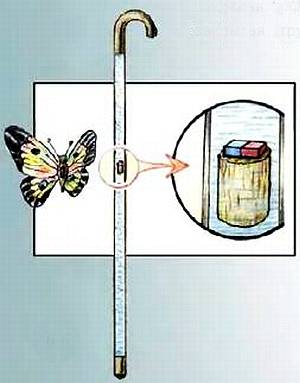 Сделайте из голографической пленки и бумаги большую яркую бабочку и приклейте к ней маленький, но сильный магнит или кусочек железа. «Маэстро» сажает на тросточку бабочку, и она ползет по ней вверх. Переворачивает тросточку, вновь сажает на нее бабочку, и она опять ползет вверх…