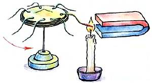 Из железной проволоки или швейных иголок сделайте звезду наподобие изображенной на рисунке и установите на острие иглы. Рядом со звездой поставьте магнит и свечу или хорошую газовую зажигалку. Зажгите огонь и подождите. Как только луч звезды раскалится докрасна, звезда повернется, и к магниту притянется следующий ее луч. Вращение остановится, лишь когда погаснет огонь.