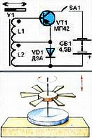 Сам по себе запуск волчка рукой еще недостаточен для получения длинной серии прыжков. Это происходит благодаря подпитке его энергией магнитного поля от катушки и специального генератора, схема которого показана на рисунке. Катушки L1 и L2 наматывают на каркасе из картона, одновременно сложив вместе два провода диаметром 0,1–0,15 мм, по 1000 витков. Внутрь каркаса вставляют сердечник из мягкой стали. Можно использовать кусок арматурного стержня, только нужно его предварительно отжечь: нагреть докрасна и дать медленно остыть на воздухе.