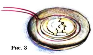 Вот как, например, можно сделать копию одной из сторон старой монеты. Положите ее на чистое стекло и залейте воском, предварительно заложив в него медные проволочки, как это показано на рисунке 3.