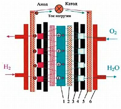 1— мембрана; 2— катодная (или анодная) плата; 3— газодиффузионная пластина; 4— графитовый блок; 5— проводящая плата; 6— блоки подведения водорода, кислорода и отвода воды.