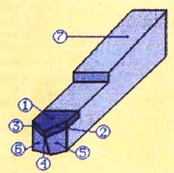 1— передняя поверхность; 2— главная режущая кромка; 3— вспомогательная режущая кромка; 4— вершина резца; 5— главная задняя поверхность; 6— вспомогательная задняя поверхность; 7— вспомогательная часть.