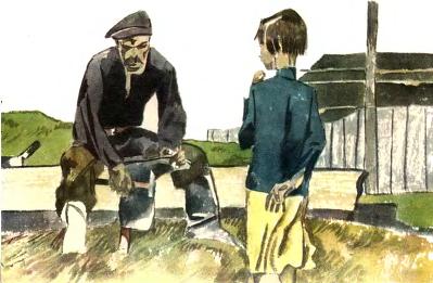 Павел Иванович сидел возле избы на бревне и чинил сапоги.