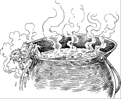 Фальшиво напевая себе под нос, великанша отнесла ведро к плите, водрузила его на трясущееся от жира плечо и опрокинула в котел. Прутика выплеснули в пузырящееся клейкое месиво! Когда он упал, жидкость только булькнула: чвяк!