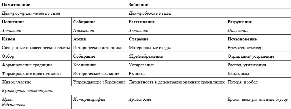 Память свободно управляет как воспоминанием, так и забвением, что включает в себя даже восприятие трудноконтролируемых движений между осознанием и неосознанностью. Вместо того чтобы считать памятование и забвение абсолютно противоположными или даже делать выбор в пользу одной из этих противоположностей, целесообразнее изучить промежуточное пространство между ними, а также формы их скрещения и пересечения. Подобный анализ сможет выявить дифференциацию градаций, оттенков, скользящих переходов между передним планом осознанного и задним планом неосознанного или бессознательного. Далее будет сделана попытка продемонстрировать динамику воспоминания и забвения в культурной памяти с ее различными институциями и фазами, а также с учетом действия как центростремительных сил сохранения и консервации, так и центробежных сил рассеивания и разрушения. При этом будут рассмотрены три разных уровня и вида взаимосвязей. Во-первых, памятование и забвение происходят как в активном, так и в пассивном варианте, причем следует подчеркнуть, что архив с необходимостью активен по отношению к функции консервации, однако скорее пассивен по отношению к иерархии, действующей в культурной памяти. Во-вторых, приведенная схема указывает на разделение функций и взаимодействие различных институций. Музеи и библиотеки, гуманитарные науки (филология, искусствознание, археология) работают как в сфере канона, так и в сфере архива. Схема отражает подвижность культурных объектов в поле напряжения между памятованием и забвением. Жизнедеятельность культурных объектов осуществляется между каноном, архивом и децентрализованными хранилищами. То, что попало в архив, может при переоценке или переосмыслении вернуться в канон, а артефакты, сохранившиеся под землей, могут быть возвращены в музеи археологами или палеоисториками. Пассивное забвение не окончательно; обнаруженные реликты могут опять попасть в хранилища или выставочные залы. Но это лишь отчасти справедливо для активного забвения. Того, что насильственно разрушено или сознательно уничтожено, уже не вернуть. Здесь остается лишь возможность рассказать или создать копию, чтобы вспомнить утрату и предотвратить полное забвение. Но предлагаемая схема не должна вводить в заблуждение, ибо и на нее распространяется смысл изречения: «Наибольшая часть утрачивается» (и это хорошо).