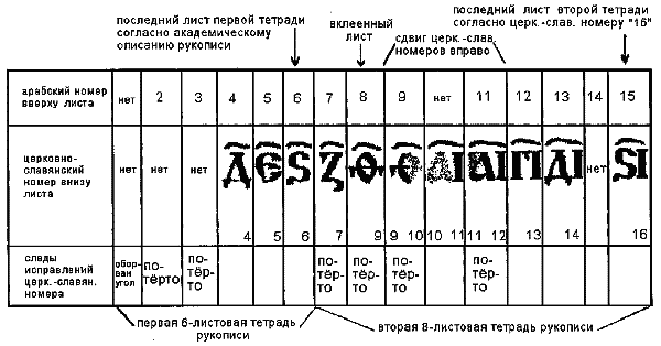 При внимательном изучении церковно-славянских цифр первых двух тетрадей видно, что номера трех листов: 10-го, 11-го и 12-го по церковно-славянской нумерации, кем-то исправлены. А именно, номера увеличены на единицу. Прежние их церковно-славянские