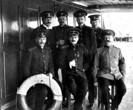 Первый ряд (слева направо): лейтенант К. В. Ломан, капитан 2-го ранга А. В. Колчак, доктор Э. Е. Арнгольд. Второй ряд (слева направо): лейтенант Н. А. Гельшерт, лейтенант В. В. Нилендер, лейтенант Г. Л. Брусилов, лейтенант А. К. Пилкин