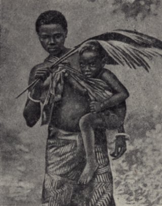 Меланезийка, защищающая ребенка от солнца пучком пальмовых листьев.