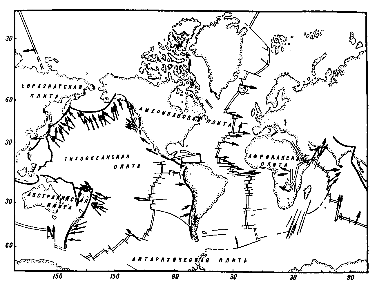 Карта взаимоотношений плит литосферы на поверхности Земли.