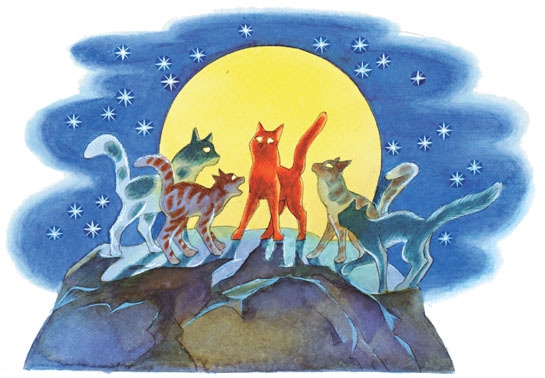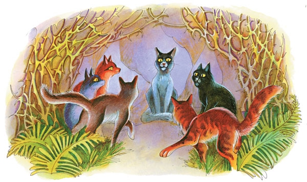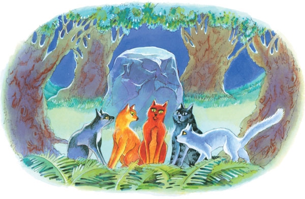 После одной такой страшной битвы, когда земля под четырьмя исполинскими деревьями стала красной от пролитой крови, души умерших котов вернулись на землю, чтобы умолять о мире. Они воззвали к самым сильным котам каждой территории: к Ветру, Реке, Грому, Тени и Небу.