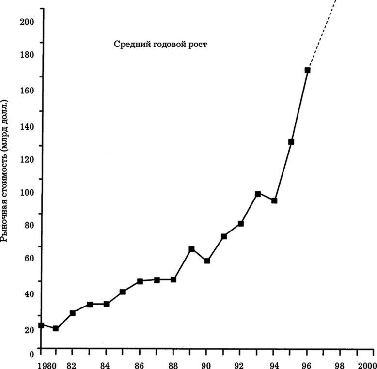 В условиях, когда производство продукции все более теряет ценность, производители, которые по-прежнему стремятся заполучить большую рыночную долю, в итоге обнаруживают, что их прибыли сокращаются, хотя доходы растут. Это, в свою очередь, препятствует обеспечению ими достаточно высокой акционерной стоимости. Такой образ действий все еще демонстрируют десятки компаний на десятках рынках, основанных на производстве продукции. Находясь на должности руководителя General Electric, Джек Уэлч трижды осуществлял перепроектирование модели GE, и каждый раз он все дальше уходил от традиционной производственной модели, ориентированной на продукцию. Динамика перехода стала следующей. Первым вариантом ориентации на прибыль был лозунг «Будь в своем деле номером один или номером два», вторым стал девиз «Освобождайся от лишнего», а третий вариант представил модель бизнеса, ориентированную на прибыль и на потребителя: «Продажа решений». Последовательная смена приоритетов наглядно демонстрирует, каким образом Уэлч постоянно реагировал на изменения запросов потребителей GE. В результате рыночная стоимость General Electric выросла с 13 млрд долларов в 1981 году, когда Уэлч был назначен ее руководителем, до 410 млрд долларов во время отставки его в 2001 году (см. рис. 4.2) [4] .