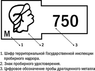 Вид и структура клейма Пробирной палаты РФ приведены на рис. 3.5. На клейме отображается проба драгоценного металла и одетая в кокошник женская голова в профиль, направленная вправо. Шифр территориальной госинспекции пробирного надзора указывается в виде буквы русского алфавита. Например, для Государственной инспекции пробирного надзора по Москве и Московской области в нижнем левом углу клейма указывают букву «М» [123] .