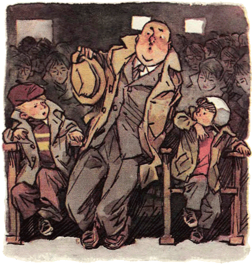 В кино они взяли билеты и купили два мятных пряника. Вдруг зазвонил звонок. Костя бросился занимать место, а Шурик где-то застрял.