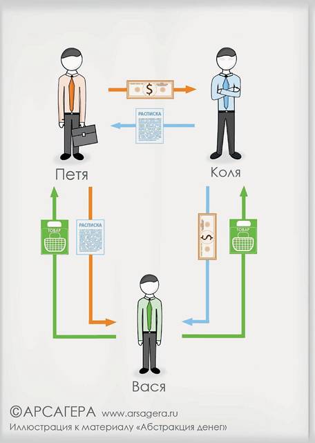 Начнем с бытовой ситуации: у Пети есть 100 рублей, и он дает их в долг Коле под расписку. Коля может купить у Васи товаров на 100 рублей. Петя тоже