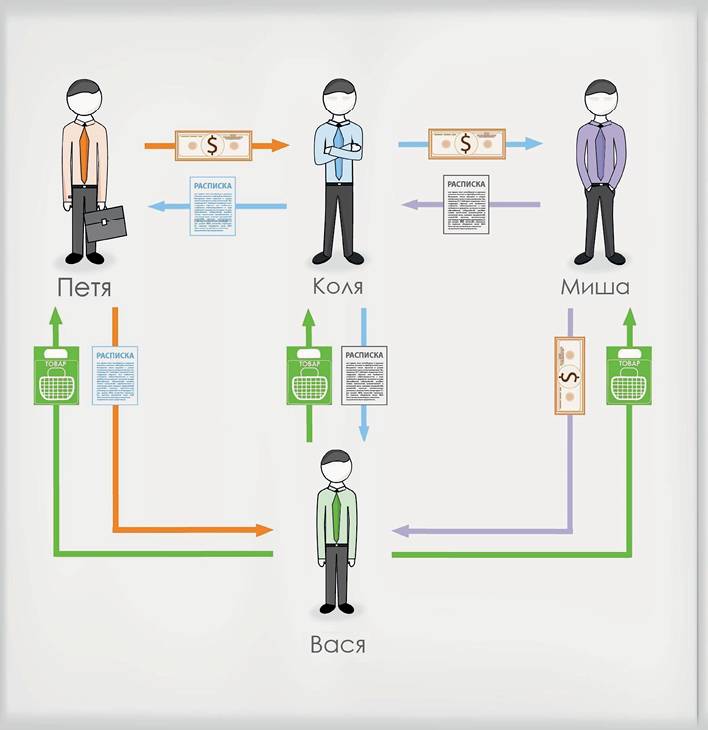 может купить у Васи товаров на 100 рублей, расплатившись распиской Коли, если Вася, так же как и Петя, доверяет Коле и считает, что тот сможет вернуть 100 рублей. Получается, мнение Пети и Васи о том, что Коля может вернуть долг, позволило Васе продать товаров на 200 рублей, при том что денег в наличии имелось только 100 рублей.