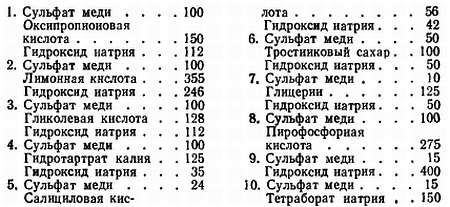 Раствор, содержащий сульфат меди и сахар, следует вливать в раствор щелочи. Плотность раствора при 16 °C 1,10. Аноды — медные. Режим работы следующий: температура 25–40 °C, катодная плотность тока 0,01 А/дм2. Изделия после погружения в ванну выдерживаются без тока в течение 1 мин.
