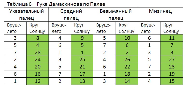 Допустим, что дата рождения Христа записана правильно. Если сравнить данные, полученные по таблице 7 (они выделены жирным шрифтом), с индиктовыми датами по Палее, то будет видно, что индикты полностью совпадают. Рассмотрим дату крещения. Круг Солнцу, соответствующий вруцелету 3 безымянного пальца, равен 14, тогда как по таблице должен быть равен 15. Круг Солнцу для даты распятия вовсе не соответствует значению из таблицы 7. Допустим, что под записью «круг Солнцу 7» имеется в виду указание на вруцелето одного из пальцев. Действительно, отсчитав по руке три года от вруцилето 3 безымянного пальца, попадаем на вруцилето 7 среднего пальца. Как и в предыдущем случае получаем число круга Солнцу на единицу меньшее, чем должно было быть на самом деле (17 вместо 18). Логично будет предположить, что рисунок руки Дамаскиновой сделан неверно. Необходимо сместить все значения круга Солнцу на единицу.