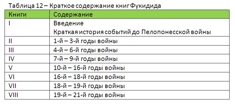 Теперь о том, что касается лунного затмения. «История» Фукидида дошла до нас в восьми книгах, краткое содержание которых сведено в таблицу 12.