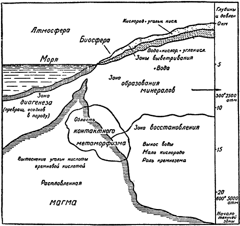 Мы начнем изучение минеральной жизни Земли с недоступных исследованию глубин — с зоны «магмы», там, где температура немного выше 1500°C и где давление достигает десятка тысяч атмосфер.