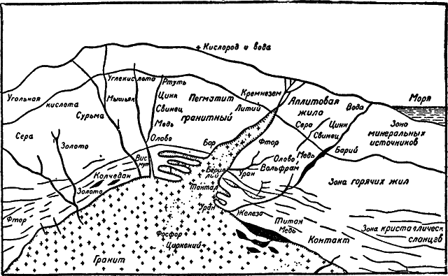 Разрез через массив гранита, с ветвями гранитных жил и выделением разных металлов и газов.