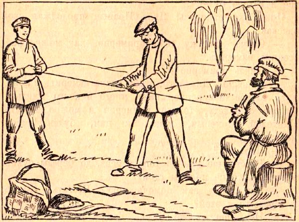 — Не двигайтесь, погодите, мне надо в тетрадке нарисовать, как у вас трубки направлены. Глядите, я рисую в тетрадке нашу веревку, только делаю ее в 25 раз короче, чем она на самом деле. Теперь я подведу тетрадку под твою трубку, Василий, и нарисую, как она от веревки отклоняется, нарисую угол этот самый, что между трубкой и веревкой. Теперь, на другом конце нарисованной моей веревки я наведу твой угол, Пантелей Семеныч.
