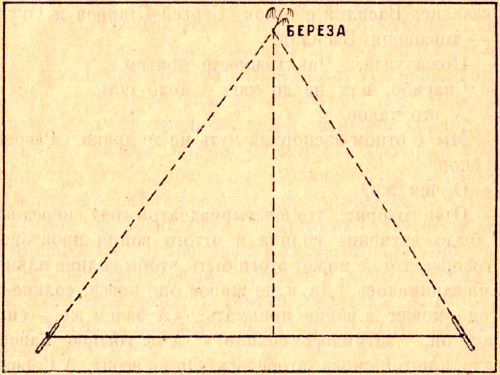 Глаза смотрели с разных концов, а сошлись на березе. В этом месте стоит наша береза. Смерим теперь сколько в тетрадке от веревки до березы? Примерно, 50 сантиметров. А на самом деле должно быть в 25 раз больше, т. е. 12 1/2 метров, потому что веревка наша в моей тетрадке в 25 раз меньше настоящей веревки, и весь этот треугольник получился в 26 раз меньше. Теперь, Василий, проверь меня: я говорю, что до березы 12 1/2 метров, т. е. шагов 18. Ну, шагай! Проверяй, правду ли я говорю.
