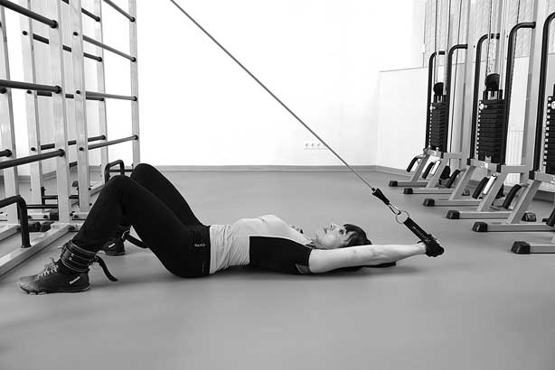 Еще одно упражнение, которое называю «пулл-овер». Исходное положение: лежа на спине, руки за головой, резина зафиксирована за нижнюю часть неподвижной опоры, ручки амортизатора в руках. Прямые руки из исходного положения нужно на выдохе поднять над грудью и аккуратно опустить на пол (фото 61 a, б). У вас заработают межреберные мышцы и диафрагма, и это поможет нормализовать давление. Подготовленным можно выполнять это упражнение на скамье (фото 62 a, б).