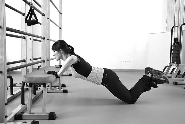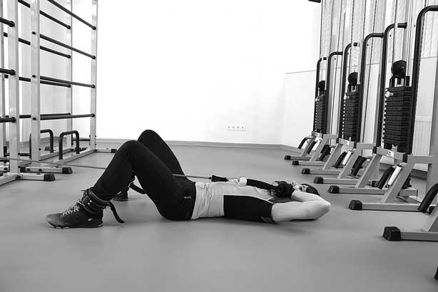 Для ног я посоветую выполнять тягу резинового амортизатора к ягодице. Ложитесь на живот ногами к неподвижной опоре, за которую зафиксирован один конец резинового амортизатора, а другой закреплен к нижней трети голени ноги. На выдохе постарайтесь согнуть ногу в коленном суставе по направлению к ягодице и вернуть ногу в исходное положение. Выполнять это упражнение нужно не менее 20 повторений, затем повторить то же самое с другой ногой (фото 63 a, б).