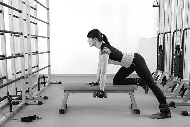 Отжиматься можно от стола, от стула или от стены. Тело прямое, руки согнуты в локтевых суставах. Отжимаясь, разгибайте руки на выдохе (фото 18 a, б). Отжиматься следует сериями по 5–10 повторений.