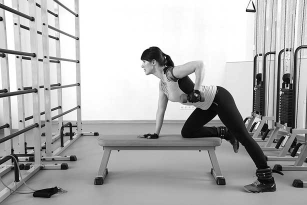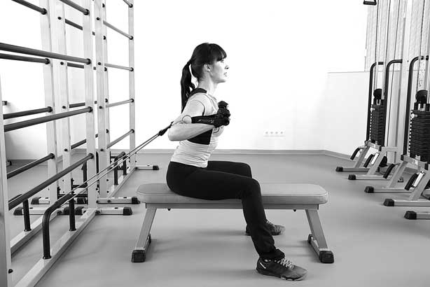 Завершив тяги, приступайте к жимам. Для этого зафиксируйте резиновый бинт за нижнюю часть неподвижной опоры. Сядьте спиной к этой опоре и выполняйте жим вперед сначала одной рукой, затем другой (фото 17 a, б).