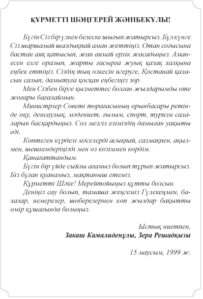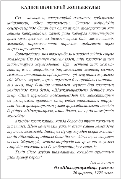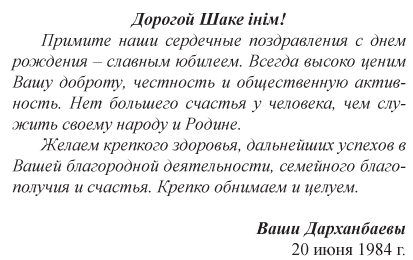 После вступления в брак с моей матерью, Зайтуной Мусабаевной, которая была моложе его на 10-12 лет, их вторым ребенком оказался я. Это произошло летом 1925 года, в год священной коровы, по-казахски «сиыр жылы», в ту пору, когда крестьяне приступают к сенокосу. Хочу сразу же уточнить, что в 1932 году в городе Житикара, перед тем как отдать меня в школу, родители увеличили мой возраст на один год. В ту пору в первый класс зачисляли только восьмилетних детей. На подобный шаг они пошли вынужденно, чтобы я мог воспользоваться просяной кашей, которой на большой перемене подкармливали учащихся в те голодные времена. С тех пор я числюсь родившимся в 1924 году. После обретения самостоятельности, уважая волю родителей, я не стал восстанавливать свой истинный год рождения. Это, откровенно говоря, пошло мне на пользу. Я удовлетворен тем, как сложилась моя дальнейшая судьба.