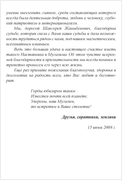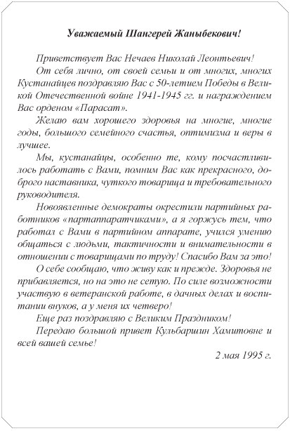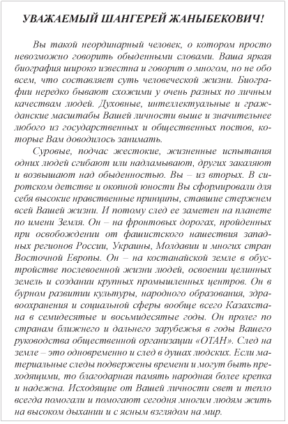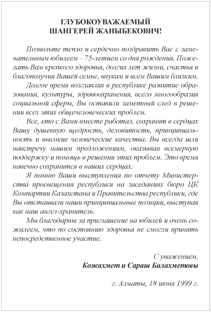Какой это был (и, разумеется, остается) прекрасный семьянин. Наши сыновья учились в одном классе, и я всегда по-доброму изумлялся тому, что городской «голова» при всей своей занятости непременно присутствовал на родительских собраниях. И это при том, что его супруга Кульбаршын Хамитовна, верный друг и талантливый педагог, будучи директором этой школы, понятное дело, детально знала об учебных делах своих детей. Но Шангерей Жаныбекович как отец считал необходимым иметь информацию из первых рук, а кроме того – и это, пожалуй, самое главное – надо было давать пример тем отцам, которые явно забывали о долге перед своими детьми и обществом. Как приятно и трогательно было видеть вечерами и по выходным первого человека города со стайкой своей ребятни.