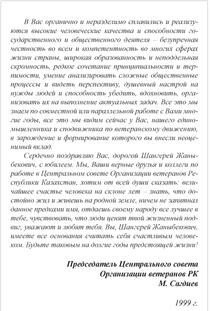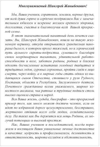 Считаю его одним из своих настоящих учителей и я, постоянно общавшийся с ним на работе в пору, когда мне особенно нужна была опора и верный ориентир. Можно привести многочисленные примеры предметных уроков того, как надо относиться к порученному делу. Шангерей Жаныбекович к любому вопросу подходил ответственно, вникал в его суть основательно, решения принимал после всестороннего изучения проблемы. Большой
