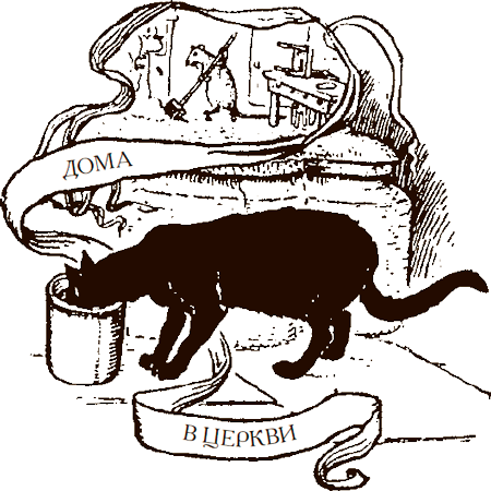 Простодушная Мышка снова поверила Кошке, а та шмыгнула в церковь и как следует приложилась к горшку с топлёным салом.