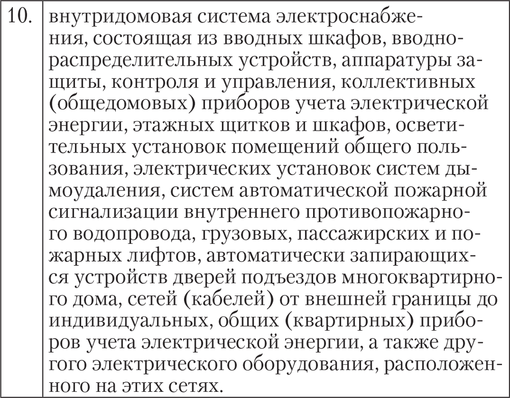 • внутридомовая система электроснабжения, состоящая из вводных шкафов, вводно-распределительных устройств, аппаратуры защиты, контроля и управления, коллективных (общедомовых) приборов учета электрической энергии, этажных щитков и шкафов, осветительных установок помещений общего пользования, электрических установок систем дымоудаления, систем автоматической пожарной сигнализации внутреннего противопожарного водопровода, грузовых, пассажирских и пожарных лифтов, автоматически