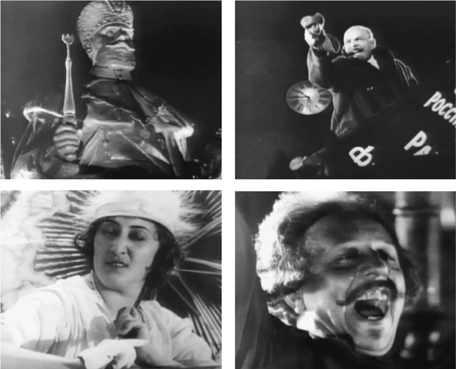 В начале фильма нам в деталях показывают статую царя — на экране чередуются кадры, которые дробят ее на отдельные части, почти как на картинах кубистов. Затем кадры выстраиваются в причинно-следственную цепочку: мы видим, как на памятник натягиваются веревки. Дальше чередование кадров используется для сопоставления противоположностей: в них появляются то винтовки, то косы. Потом следует почти лишенное логики повторяющееся действие: мы несколько раз наблюдаем с разных ракурсов, как царский трон падает с пьедестала. После чего на экране мелькают крупные планы поющих людей, а затем кадры с людьми перемежаются кадрами с взрывами военных снарядов.
