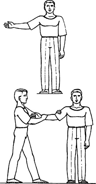А теперь пусть ваш друг осторожно и мягко, чтобы не спугнуть вашу мысль-образ о струе воды, возьмёт вашу руку, как показано на рисунке, и мягко начнёт её сгибать в локте. Если вы прочно удерживаете образ, то ни один человек на свете не сможет согнуть вашу руку. Ясно, что ум – образ в нём – и в этом случае должен быть неподвижным.