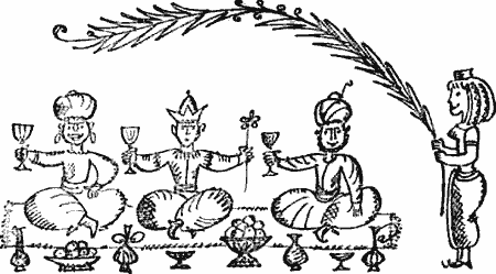 Тогда они все сели на коней и вместе с хаджибом вернулись в диван. Царь Афрах сел на царский престол, усадил царя Сайфа по правую руку, а хаджиба – по левую. Потом уселись и все остальные, каждый сообразно своему званию, и царь велел слугам принести угощение, и все занялись едой. А затем царь приказал принести кувшины с вином, чистым и прозрачным, как слезы влюбленных, и слуги стали обносить всех чашами и кубками.