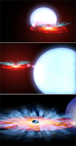 Команда астрофизиков, координируемая из Мичиганского университета, проанализировала данные, накопленные орбитальной рентгеновской обсерваторией Чандра. Спутник наблюдал за двойной системой GRO J1655-40, которая расположена в нашей галактике всего в десяти тысячах световых лет от Земли. Эта двойная система состоит из черной дыры в семь раз массивнее Солнца и вращающейся вокруг нее обычной звезды, масса которой приблизительно вдвое больше солнечной. Черная дыра притягивает вещество из звезды, которое сжимается в тонкий газовый диск, вращающийся вокруг дыры подобно кольцам Сатурна. Этот диск разогревается до пятнадцати миллионов градусов и излучает в рентгеновском диапазоне.