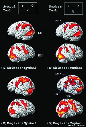 В экспериментах, проведенных под руководством Июаня Тана (Yiyuan Tang) в Даляне, люди, для которых родным языком был английский или китайский, складывали одинаковые числа (написанные арабскими цифрами). Некоторые участки мозга в равной степени активировались у всех испытуемых. Но у «англоговорящих» дополнительно возбуждался участок мозга, связанный с восприятием речи, а коренные китайцы воспринимали информацию как чисто зрительную. Возможно, это связано с тем, что на математические операции переносились особенности языков, — видимо, работа с иероглифами ближе к образному, художественному восприятию, задействующему зрительный анализатор. Могло сказаться и различие традиционных способов обучения. И как тут не отметить известное мнение, что философия Запада больше тяготеет к вербально-логическому, а философия Востока — к целостному, образному способу представления мира. Тан считает, что изучение различий в способах оперирования математическими величинами в разных культурах способно помочь в разработке оптимальных вычислительных стратегий.