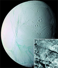 Возможно, обнаруженные неровности связаны с гравитационным воздействием ближайших спутников и самого Сатурна. Приливные силы могли настолько разогреть Энцелад, что он обзавелся собственным внутренним источником тепла, подобно Европе – спутнику Юпитера. В пользу этой гипотезы говорит и то, что тончайшая атмосфера Энцелада на 65% состоит из водяных паров, концентрация которых при незначительной массе небесного тела может поддерживаться только за счет газово-жидких извержений на поверхности. Наконец, выяснилось, что сильнее всего нагрета область поверхности вблизи южного полюса спутника, что трудно объяснить влиянием лишь поступающей от Солнца энергии. Это полностью перекраивает представление о холодной и скучной луне, не меняющейся на протяжении миллиардов лет. Более того, открытие атмосферы у Энцелада наталкивает астрономов на мысль, что спутник причастен к наполнению частицами кольца Е, самого широкого в системе Сатурна. – А.Б.