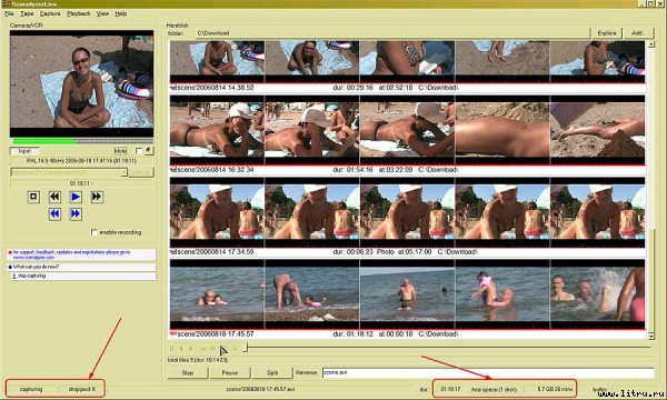 Во все время захвата вы можете заниматься другими делами — мой опыт подсказывает, что ScenalyzerLive не теряет фреймов даже при интенсивной сторонней активности (браузинг в Интернете, получение почты, редактирование в Ворде, захват скриншотов). Попробовали бы вы многоручничать с капчерными модулями Adobe или Ulead! Единственное, за чем надлежит следить краем глаза, так это за размером свободного места на диске (указано в правом углу статусной строки в нижней части экрана). Для ориентира привожу хрестоматийные цифры: