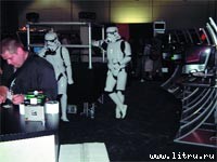 Intel на выставке не было, зато был ее ближайший заклятый приятель. На огромном и полупустом стенде AMD время от времени шли презентации MAYA, XSI и других приложений, заинтересованных в хорошем центральном процессоре. Присутствие AMD на выставке было чисто номинальным, а соседство со стендом Disney выглядело сюрреалистично [3]. Впрочем, рядом стоял стенд под странным названием Game Bunker, где компания Alienware разместила три десятка машин с процессорами AMD, на которых желающие могли порубиться в шутер Star Wars (победитель получал приз в традиционной выставочной валюте — футболку с неразборчивым логотипом). Хозяйничали на стенде угрожающего вида роботы, выгонявшие после очередной баталии вошедших в раж игроков [4].