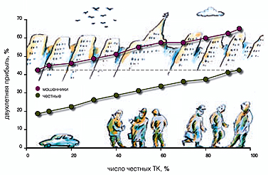 Попробуем на очень простом примере проследить, как изменяется жизнь общества в зависимости от доли мошенников в нем. Пусть в городе имеется 100 таксомоторных парков, каждый из которых использует не более 100 машин. Кроме извоза, каждая из таксомоторных компаний (ТК) занимается ремонтом находящихся в эксплуатации автомашин, продавая их остальным компаниям, а взамен проданных покупает новые или бывшие в употреблении у других компаний. При этом некоторые ТК, пытаясь увеличить свою прибыль, сознательно завышают цены на продаваемые машины. Как зависит доход «честных» и «нечестных» ТК от процента честных ТК в городе?