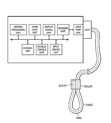 Применяемый в ноутбуках и прочих устройствах замок Kensington Lock, по мнению авторов заявки, не обеспечивает достаточной защиты. Его хоть и трудно, но можно выломать или перекусить тросик кусачками, а дальше ничего не мешает злоумышленнику использовать устройство. Предлагается исключить еще и возможность дальнейшего использования, для чего надо встроить в тросик электронный ключ и кабель, а механизм замка снабдить парой контактов. Если замок не был открыт нормальным образом и электроника компьютера не обнаружила ключ, устройство следует заблокировать. На мой взгляд, название заявки не вполне корректно: собственно кражу такое устройство не предотвратит, да и воров вряд ли отпугнет - в крайнем случае, ноутбук можно разобрать и на запчасти.