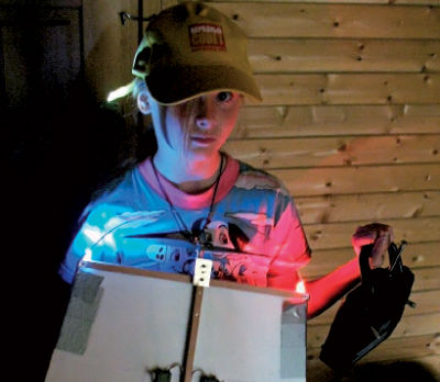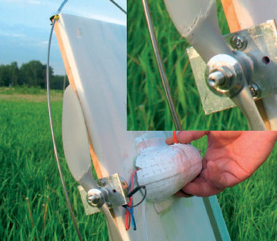 К следующим полетам в конструкцию были внесены существенные изменения. Аккумулятор был заменен на более мощный, емкостью 1200 мАч. Его я загнал в нос гондолы, а саму гондолу сдвинул максимально вперед. Центр тяжести сместился сантиметра на три. Кроме того, на "крыло" были установлены два светодиода, которые через переменный резистор подключались ко второму маленькому аккумулятору на 350 мАч, 7,4 В. Вес самолета после доработок достиг 490 г. Увы, я снова поспешил - светодиоды оказались разных номиналов и горели с разной яркостью. Но уж очень хотелось поскорее выйти в поле и "задать жару" летучим мышам.