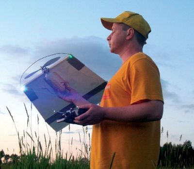 Следующий двигатель весил в полтора раза больше (E-Sky ЕК5-0002В, 45 г, 1000 об./мин.); я тестировал его уже с другим винтом - 9*6. На неполном газу он легко выдал 420 г тяги, а с винтом 10*4,7 удалось добиться тяги более 500 г. Этого было достаточно. Энерговооруженность "пепелаца" получалась 1,1–1,2 (отношение тяги к весу), почти как у СУ-30. При таких характеристиках самолет теоретически может взлетать вертикально, как ракета. В общем, можно было везти его на испытательный аэродром - на дачу.