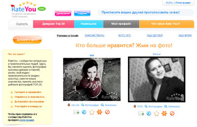 Памятное с детства "я ль на свете всех милее" сразу обретает новый смысл при посещении сервиса Rate You. Все до банальности просто: каждому посетителю предлагается выбрать лучшую из двух фотографий девушек или юношей. На свой, естественно, вкус и цвет. Далее вся процедура повторяется уже с другой парой. По итогам голосования фотографии набирают баллы и постепенно продвигаются в Топ20. Или в обратную сторону - кому как повезет. Особого смысла в подобном "состязании" нет - пожалуй, самым полезным результатом можно считать получение непредвзятой оценки снимка посторонними людьми. Ведь на самом деле нет нефотогеничных людей - есть лишь неумелые фотографы. Впрочем, вот вам и еще одно применение для сервиса - проверить свое мастерство как профессионального фотопортретиста. Также не будем забывать, что это все-таки своего рода социальная сеть, поэтому всегда можно найти собеседников в соответствующих блог-разделах, чтобы обсудить ту или иную фотографию.