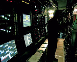 Насыщенность компьютерными системами изменила сам облик SSN-774. Так, у нее нет перископа. Используются методы фотоники [www.eo.kollmorgen.comAD-16_PMP_datasht.pdf] - информация и от оптических датчиков, и от лазерного дальномера, и от размещенных вне прочного корпуса гидроакустических систем передается внутрь по оптоволокну. Этим достигается и механическая (в рубку не опускается труба перископа), и гальваническая развязка систем. Рискну предположить, что именно последняя дает возможность использовать компоненты общего назначения. Они не имеют стойкости к спецвоздействиям, вроде электромагнитного импульса ядерного взрыва, но ток от импульса при такой схеме в лодку и не попадет. Лодки могут вести сетевую войну, то есть подключаться к внешним информационным сетям, получая от них тактическую информацию, что позволяет вести огонь по различным целям из двенадцати вертикальных пусковых установок Tomahawk и четырех торпедных аппаратов калибра 700 мм, не демаскируя себя.